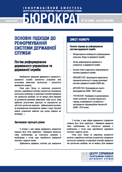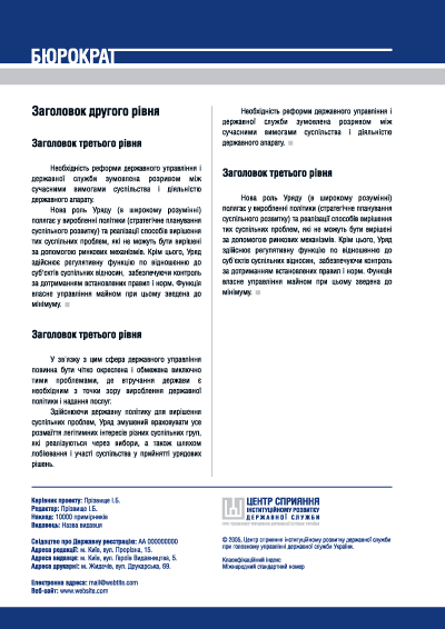 Designing cover pages and page layouts for monthly newsletter issued by the Center for Support of Civil Service Institutional Development.